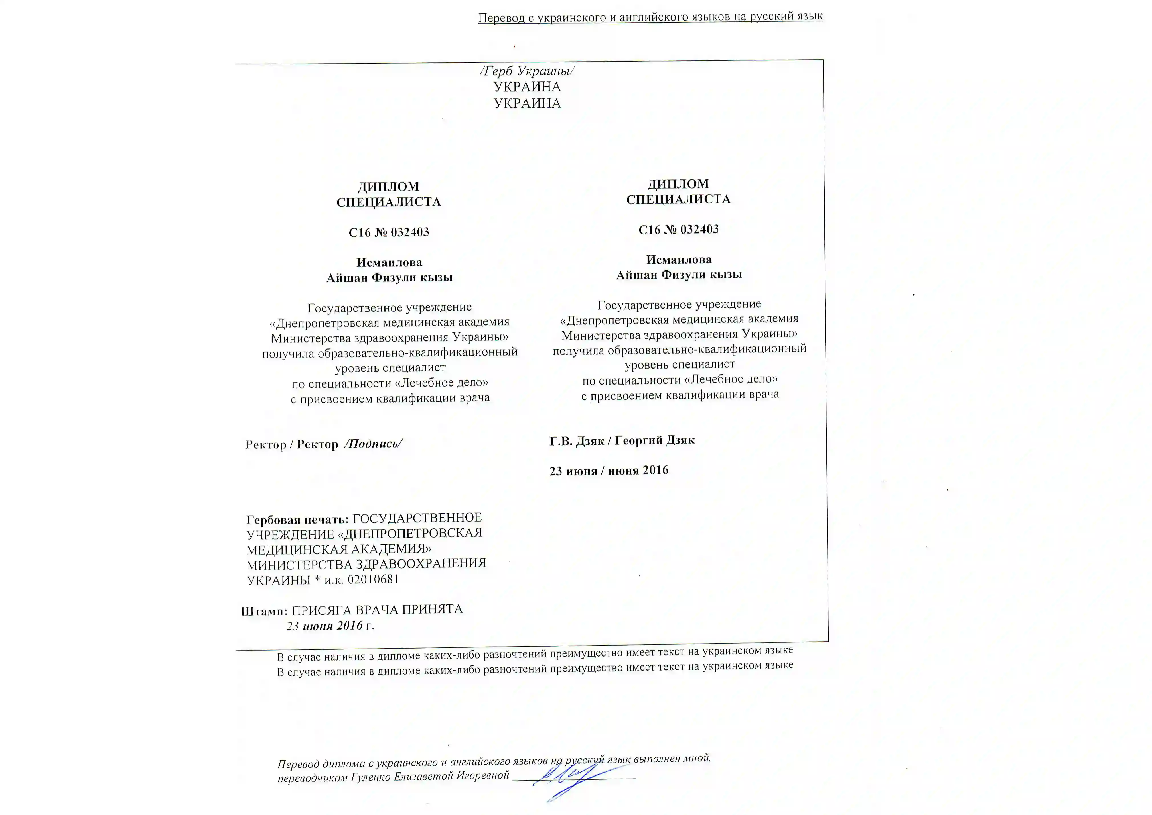 - 2016 — Днепропетровская медицинская академия (Украина). Врач по специальности «Лечебное дело».